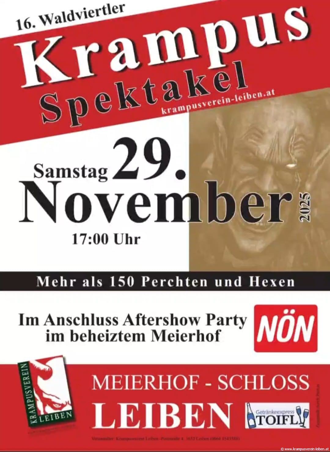 Das jährliche Highlight ist unser „Waldviertler Krampusspektakel“. Der Meierhof des Schloss Leiben ist unsere Veranstaltungsstätte, dort werden jedes Jahr ausgewählte Gastgruppen präsentiert. Zudem wird mit der Kinder- und Jugendgruppe, der Feuershow und der traditionellen Geschichtenaufführung des Vereines ein spannender und erlebnisreicher Abend für Groß und Klein geboten.